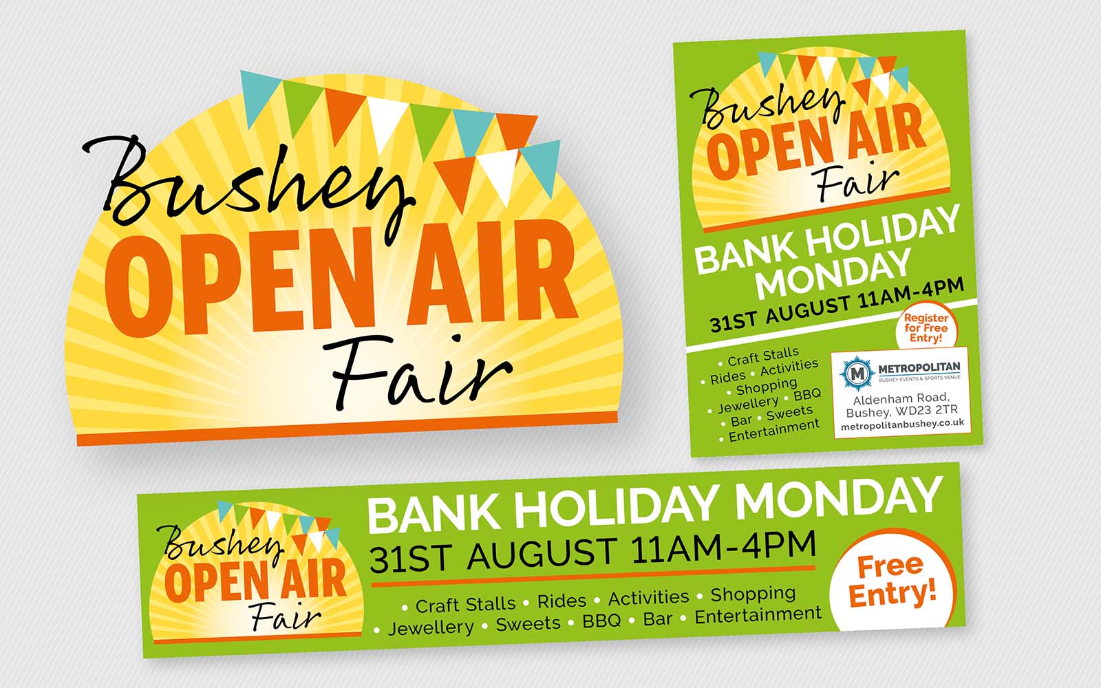 Logo design and promotional material for the Bushey Open Air Fair - a new event for 2020.